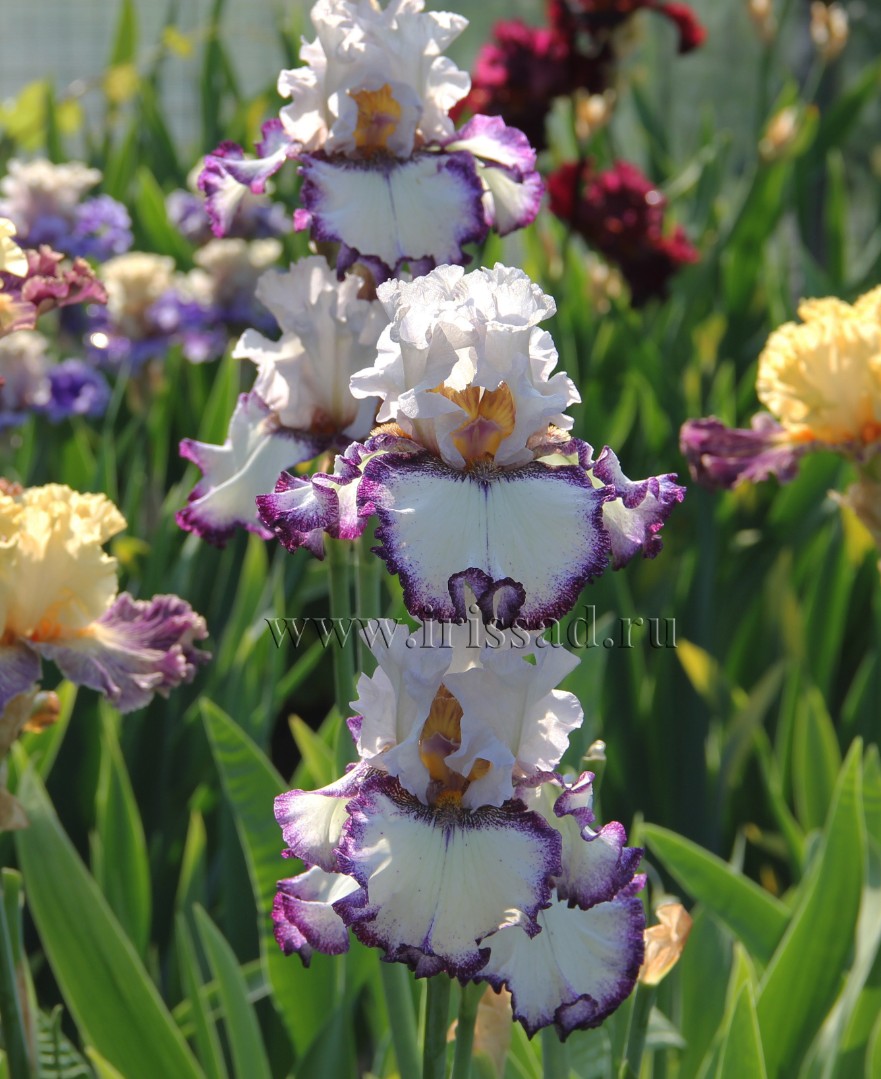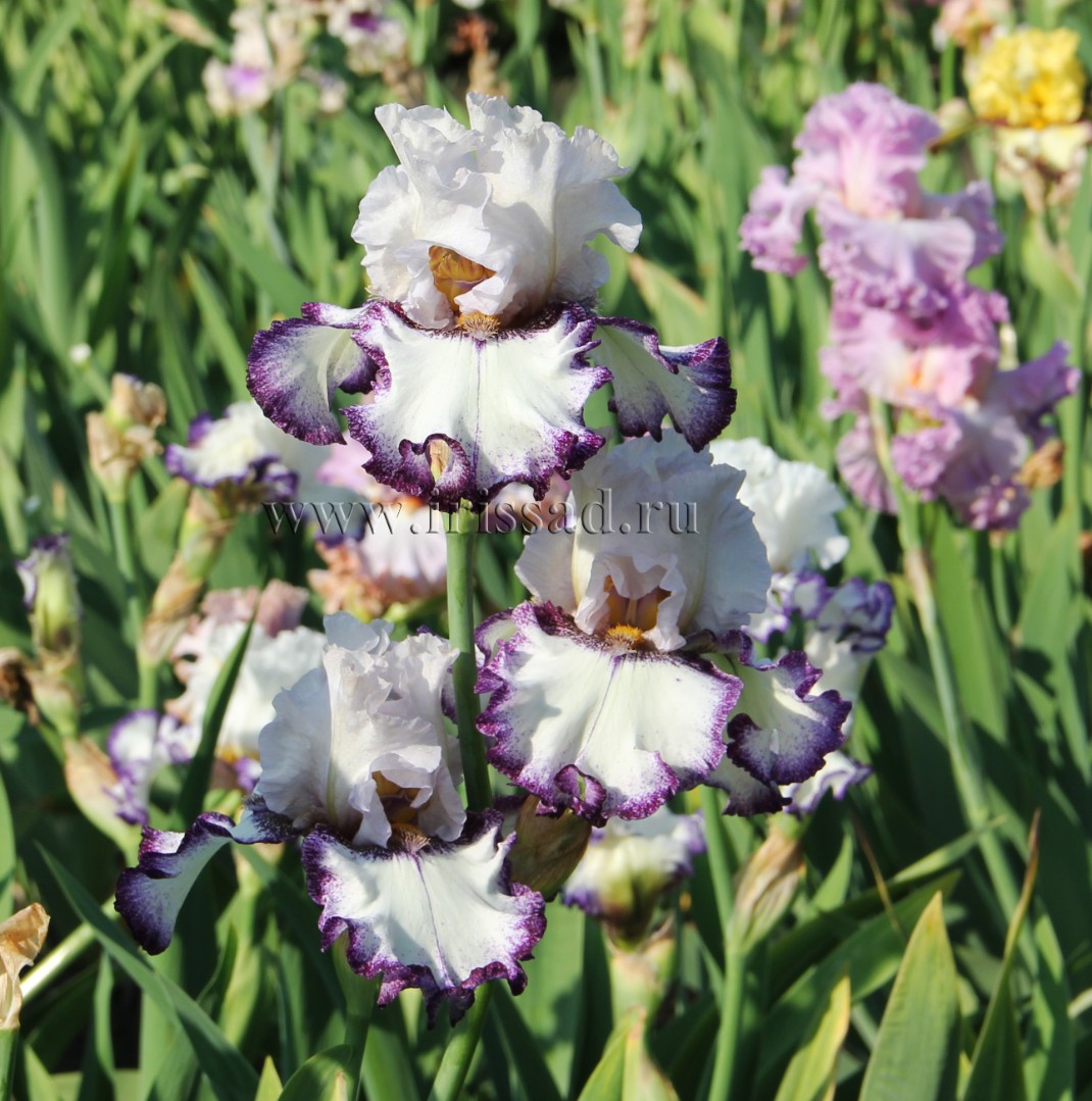Сладкий аромат. Кремово-белые штандарты с очень светлой фиолетовой прошивкой по краю и золотым ободком. Фалды ярко-белые с темно-фиолетовой прошивкой по краю и черенку. Бородка белая у основания, затем фиолетовая и, наконец, оранжевая на кончике. Очень темные ветви горчично-желтого цвета создают резкий контраст. Венцом великолепия являются невероятные выставочные стебли, которые хорошо разветвлены и распускаются, образуя последовательно 18 бутонов. Очень длительный период цветения, который начинается с ранних бутонов и продолжается до конца сезона. Впечатляет!!