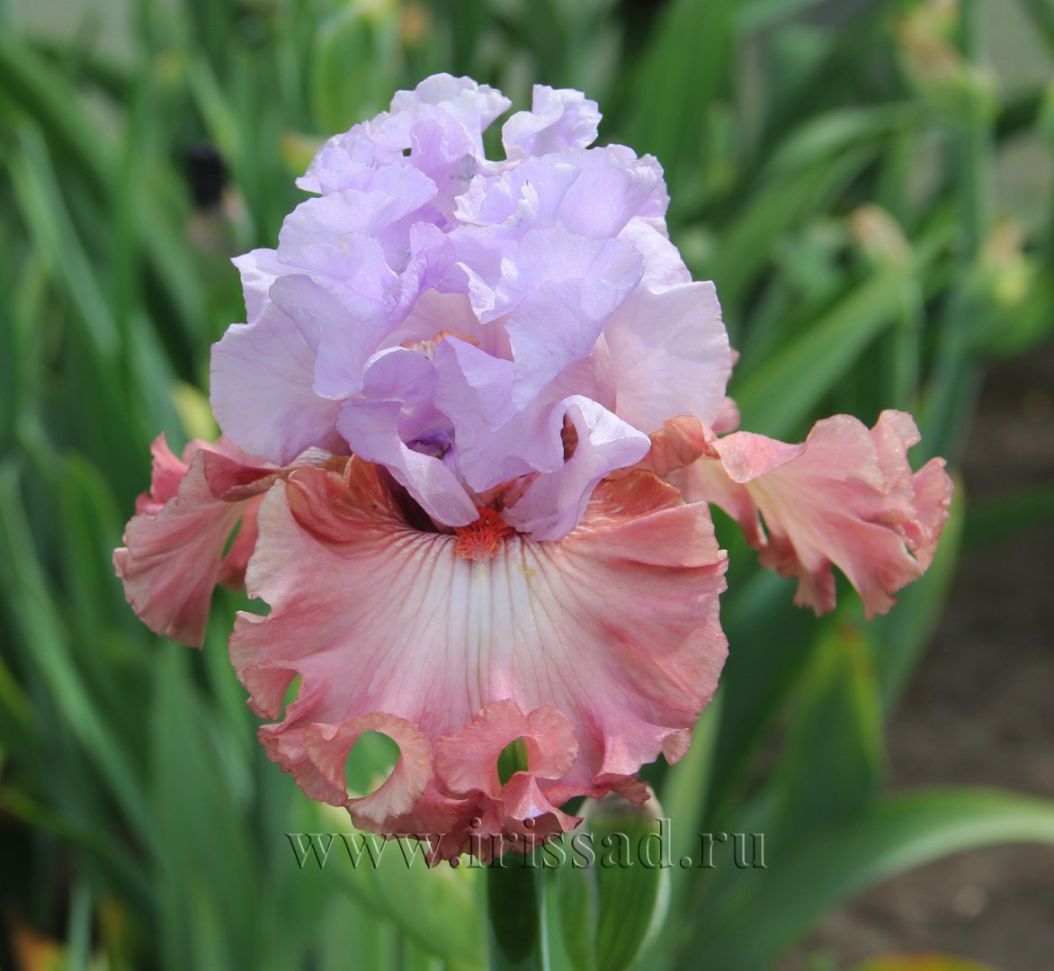 Средние стандарты лавандово-голубого цвета. Водопад насыщенного темно-лососево-розового цвета с мандариновыми бородками. Стильные рукава приятного лососево-розового цвета