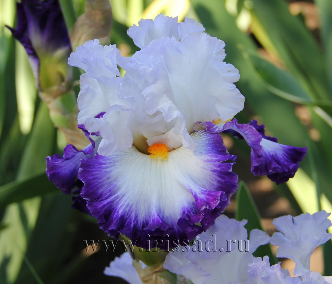 Вертикальные сине-белые стандарты имеют узкую золотую оправу. Чрезвычайно широкие фолы с перекрывающимися стволами имеют большое белое центральное пятно, окаймленное очень широкой темно-сине-фиолетовой полосой, переходящей в темно-красно-фиолетовую у вершин. Золотисто-рыжие черенки подчеркивают эти легендарные большие бороды цвета календулы. Хорошо разветвленные стебли имеют семь бутонов.
